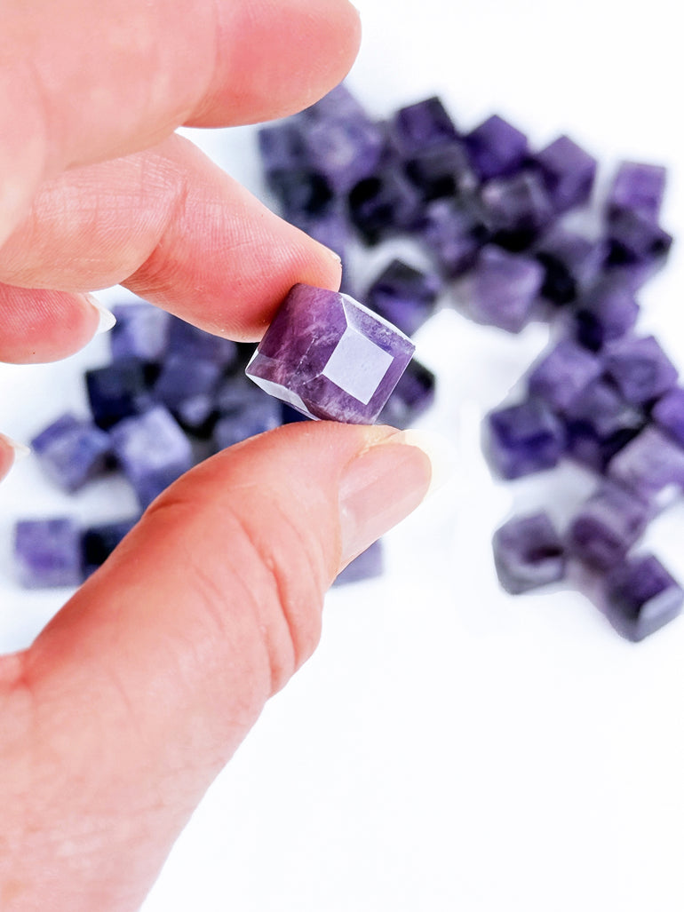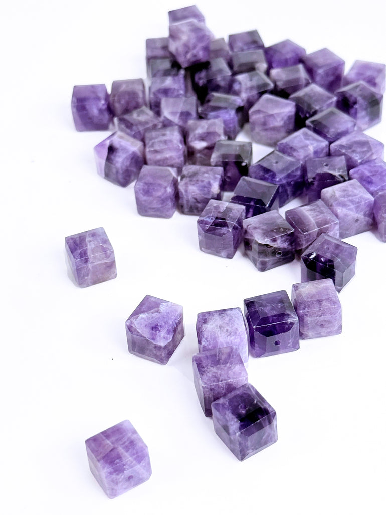 Job Lot - 180 pieces total. An Amethyst 12mm Faceted Cube refers to a gemstone bead made of amethyst, shaped like a cube with equal-length sides, and faceted cut with flat surfaces to reflect light and enhance sparkle. These beads are often used in jewelry-making, especially in bracelets, necklaces, and earrings, or even in metaphysical applications where amethyst’s properties are valued.