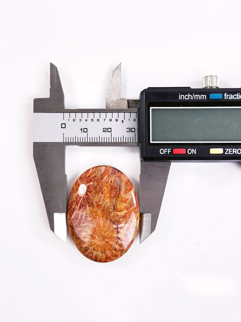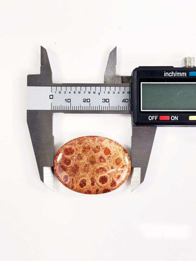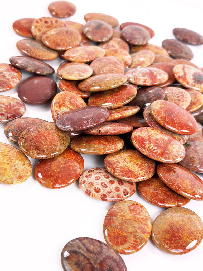 - Fossil Coral has distinctive patterns and markings that make it visually striking. A 30x40mm oval shape refers to its specific size and smooth, rounded edges, making it a popular choice for cabochons used in jewelry-making and metaphysical practices. Smooth on two sides.