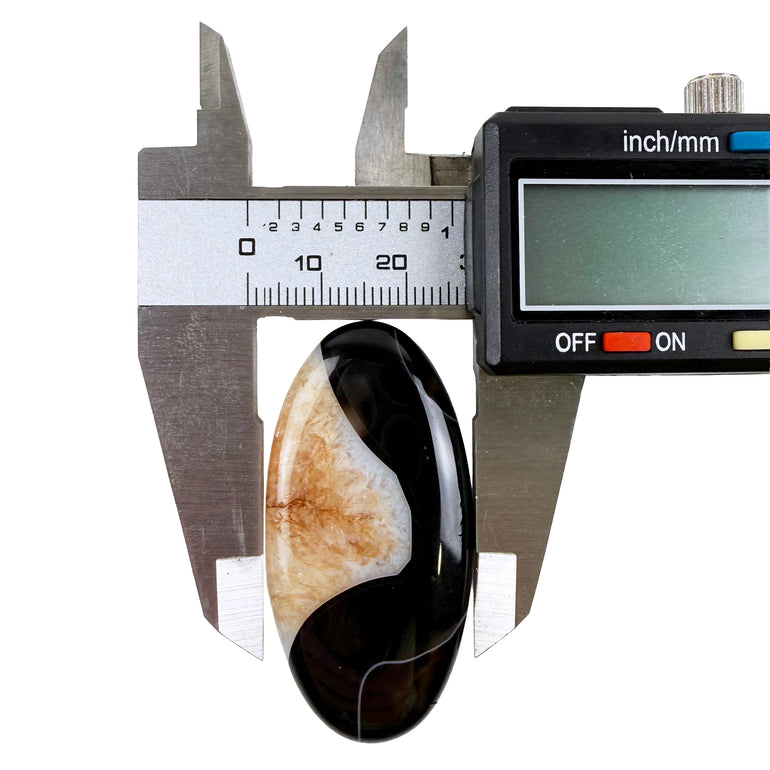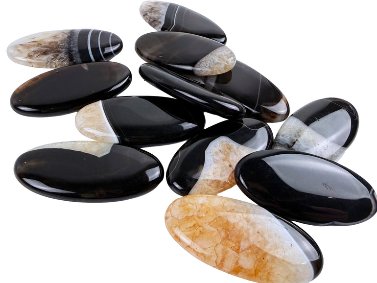 - The H-Stripe Banded 25x50mm Elongated Agate is a unique banded onyx stone characterized by parallel or wavy bands of different colors, often including shades of brown, white, cream, red, or black. Smooth on both sides. The "H Stripe" likely refers to a specific pattern of horizontal or parallel striping in the stone.